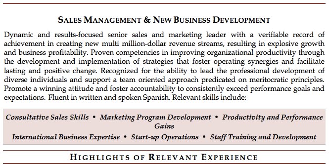 Your résumé through rose colored glasses: Depending on the industry you are working in and the position you hold, adding some color in a tasteful way can make your résumé shine. If you work in marketing, PR, or another related or similar field, adding this dash of flair can illustrate a bit of creativity on your part and will allow you to stand out from the other candidates in the pile. You might consider changing the color of the major headings to a deep maroon or something dark grey. Don’t go too crazy; you simply want to spice up the résumé a bit while keeping a professional and tactful appeal. Here’s a little sample to show you what I mean: